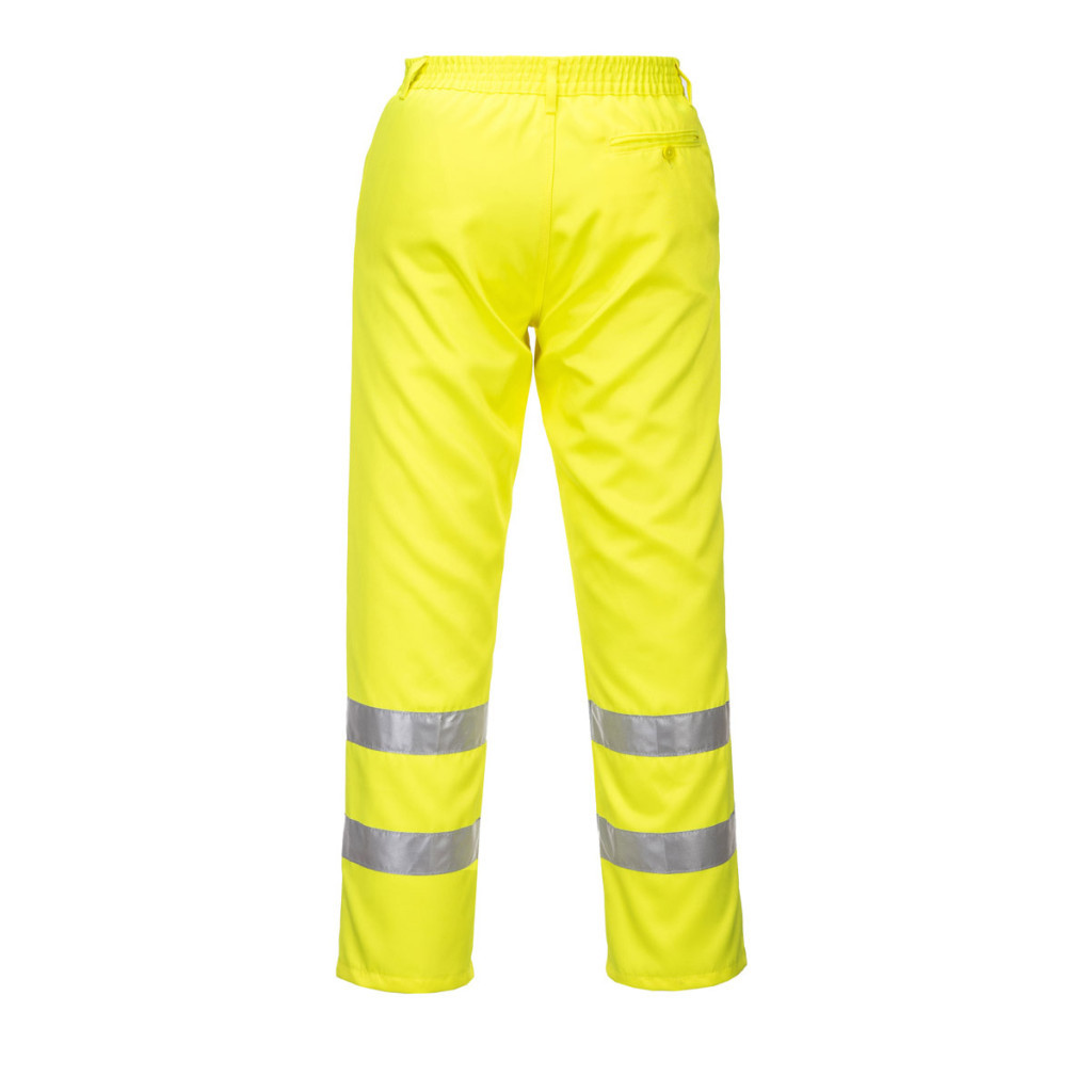 A jól láthatósági nadrág 80% poliészter és 20% pamut anyagból készült, 280g súlyú. Texpel folttaszító bevonattal rendelkezik, amely megkönnyíti a tisztán tartást. Három tárolózsebbel, hátul gumírozott derékkal, és a lábszárakon fényvisszaverő csíkokkal rendelkezik, amelyek ipari mosodai körülmények között is legalább 60 mosásig megtartják fényvisszaverő tulajdonságukat.