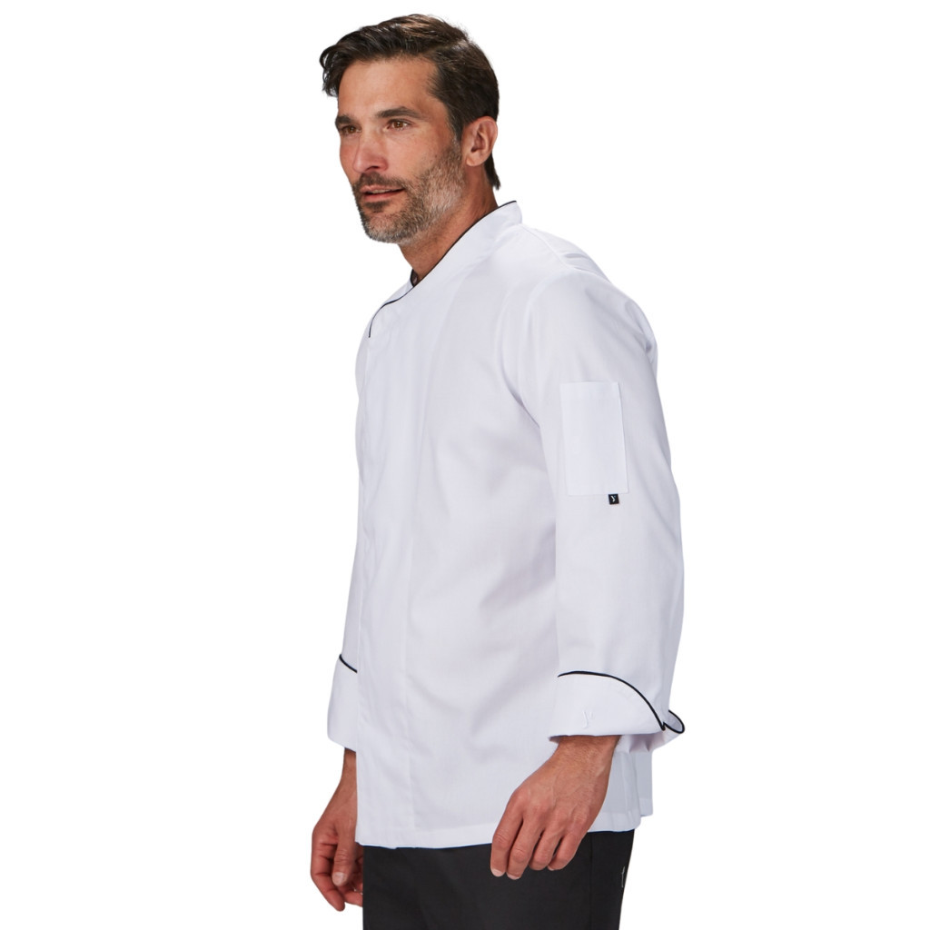 A GARYS ABAD férfi séfkabát hosszú ujjú, átlapolt fazon rejtett patentos záródással és felhajtható mandzsettával, a kontraszt gallér–mandzsetta kialakítás pedig elegáns, profi megjelenést ad a konyhában, miközben a hátul lévő AEROSILVER betét segít, hogy pörgős műszakban is jól szellőzzön és kényelmes maradjon a kabát.