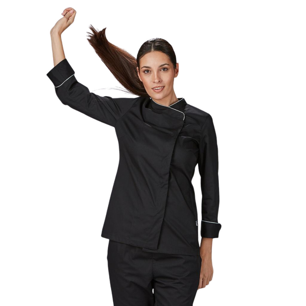 Ideális, ha olyan női szabású, strapabíró séfkabátot keresel, ami kényelmesen követi a testvonalait, és közben a kontrasztos részletekkel igényes, elegáns megjelenést ad.