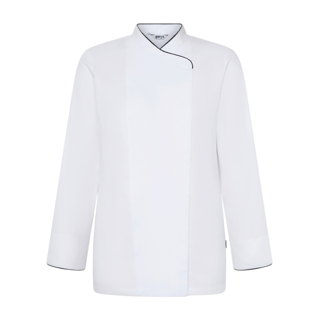A GARYS DANA női séfkabát hosszú ujjú, átlapolt fazon rejtett patentos záródással, felhajtható mandzsettával és kontraszt gallér–mandzsetta kialakítással, a mell- és hátrészen futó szabásvonalak pedig nőiesebb, rendezett illeszkedést adnak a profi megjelenéshez.