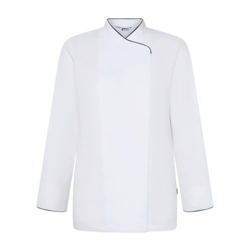 A GARYS DANA női séfkabát hosszú ujjú, átlapolt fazon rejtett patentos záródással, felhajtható mandzsettával és kontraszt gallér–mandzsetta kialakítással, a mell- és hátrészen futó szabásvonalak pedig nőiesebb, rendezett illeszkedést adnak a profi megjelenéshez.