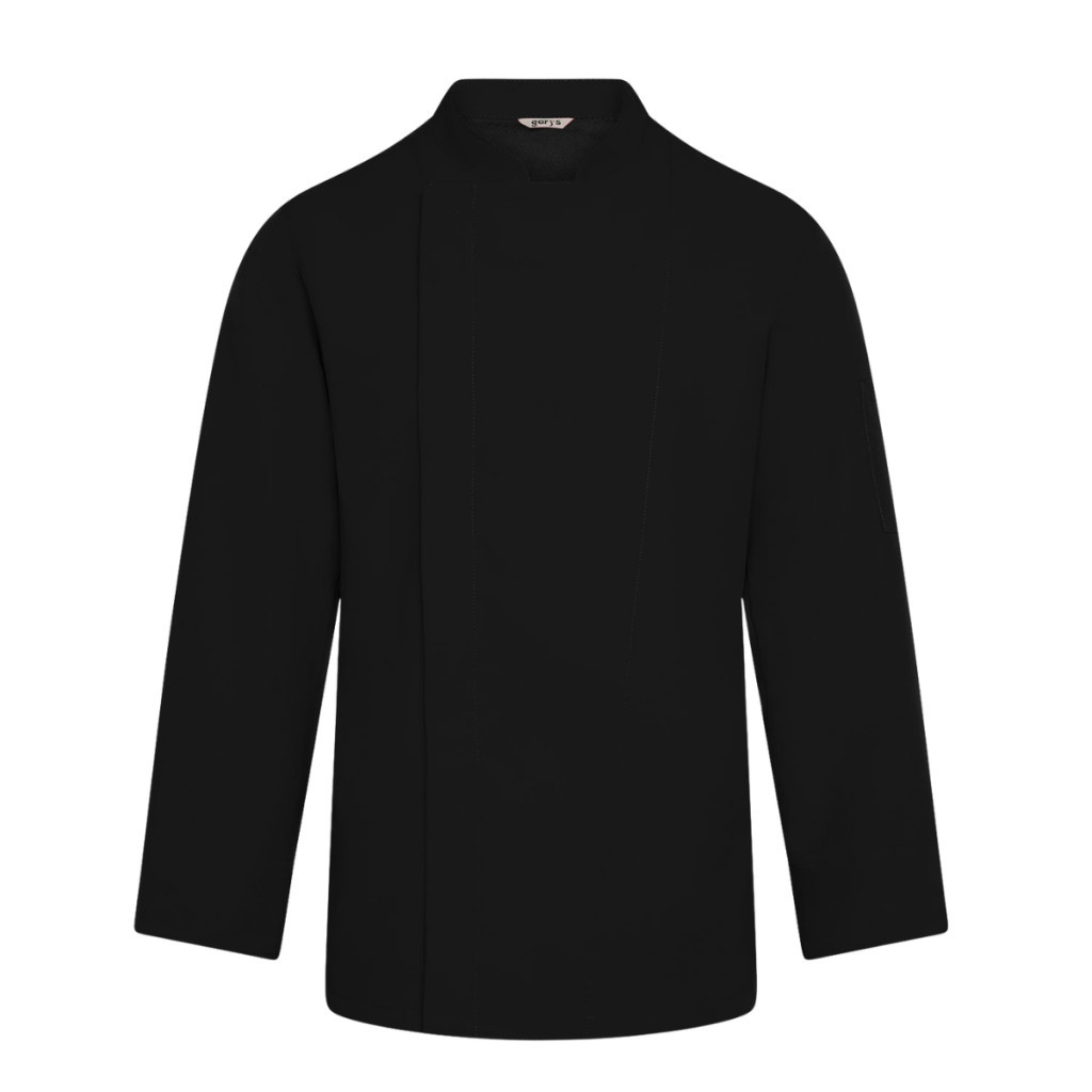 A GARYS MEJIA unisex séfkabát strapabíró twill (twill) anyagból készül (65% poliészter / 35% pamut, 200 g/m²), balról jobbra záródó, rejtett patentos elülső résszel és mao gallérral, így hosszú, pörgős műszakokban is kényelmes, mégis elegáns, profi megjelenést ad.