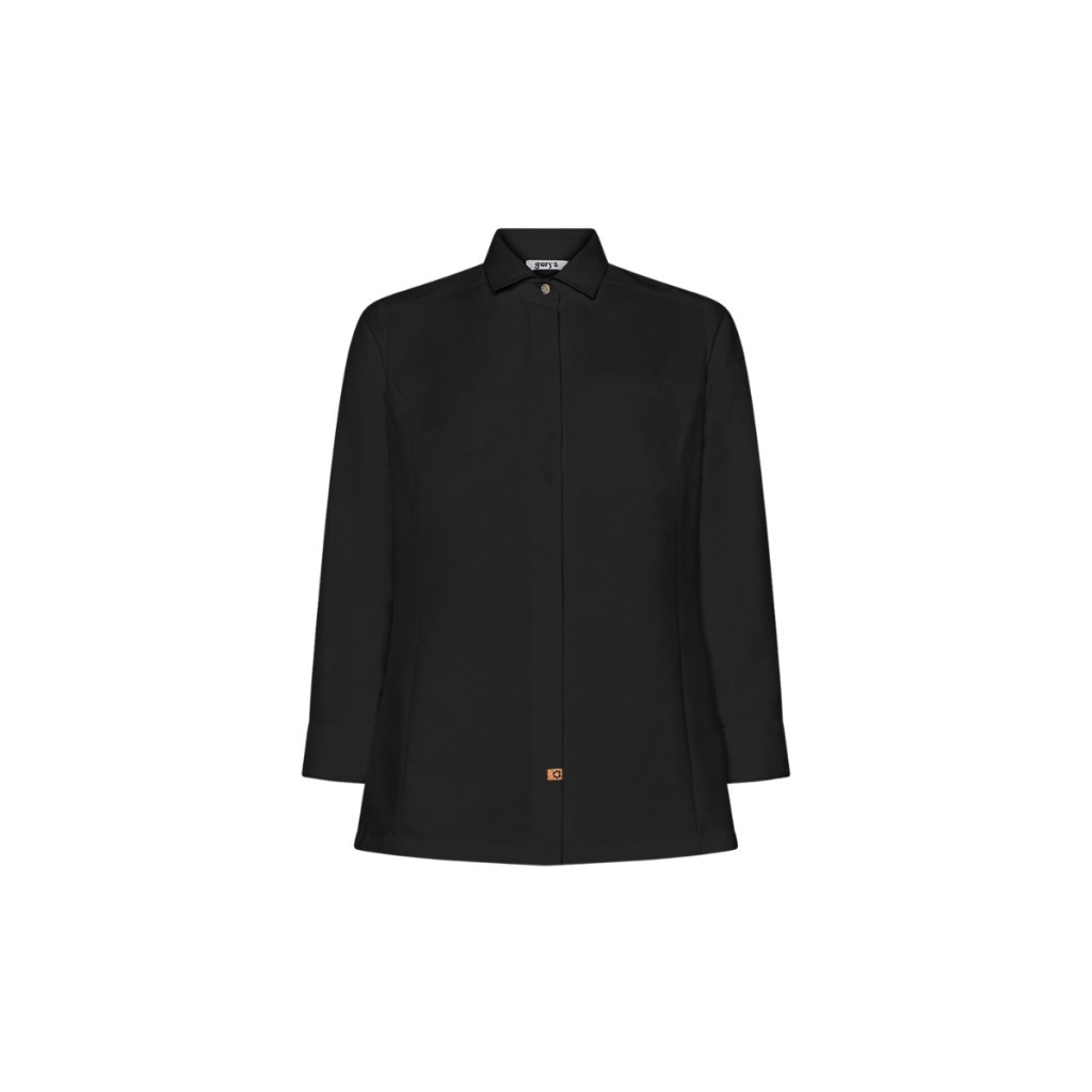A GARYS MORAL női séfkabát testhez álló fazonban, olasz gallérral készül, ahol az első gomb látható, a többi pedig rejtett, így csinos, mégis profi megjelenést ad, miközben a felhajtható mandzsetta és a váll-/illesztő varrások kényelmes viseletet biztosítanak.