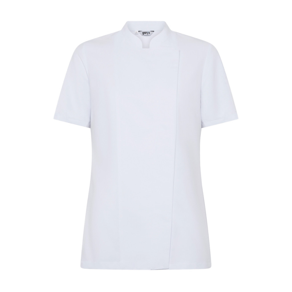 A GARYS PAZ női rövidujjú séfkabát mao gallérral, átlapolt fazonnal és rejtett patentos záródással készül, a karcsúsított szabás és a mellvarrások pedig csinos, kényelmes illeszkedést adnak a konyhai munkákhoz.