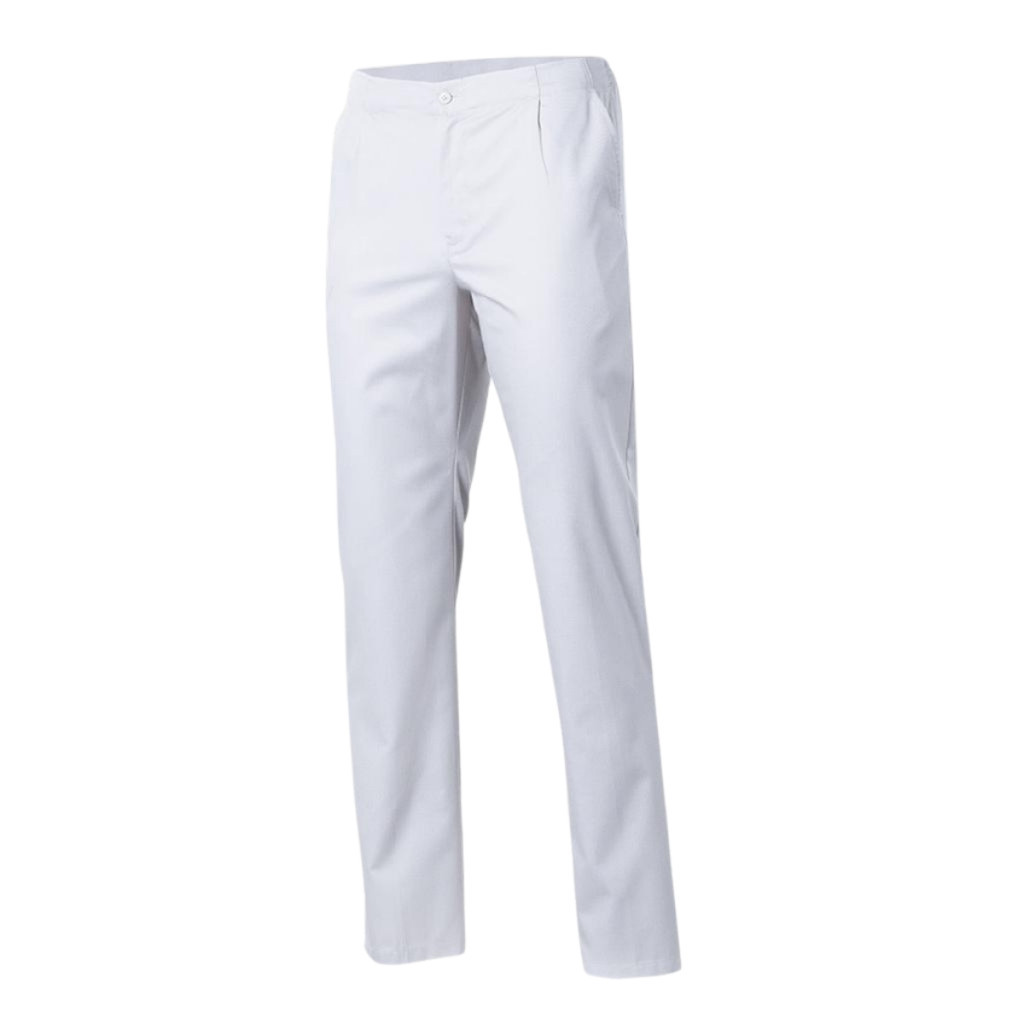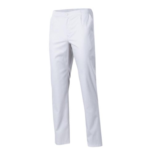Ez az egészségügyi twill nadrág unisex, egyenes vonalú fazon félig gumírozott hátsó derékrésszel, elöl cipzáras sliccel és gombos záródással, így stabilan illeszkedik és kényelmes marad egész nap, miközben a strapabíró fehér twill anyag jól bírja a gyakori használatot.