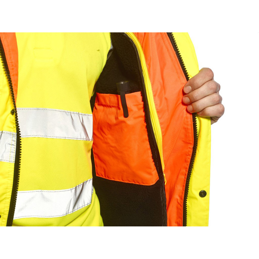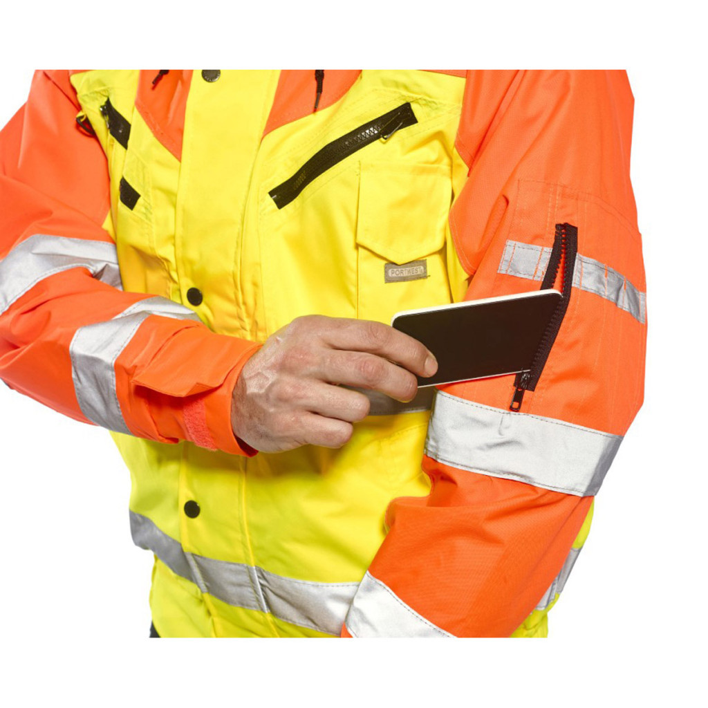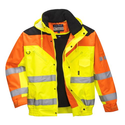 Ez a jól láthatósági bomber dzseki levehető ujjakkal és szőrme béléssel rendelkezik, amely többfunkciós lehetőséget biztosít viselőjének. A vízálló ragasztott varratok védelmet nyújtanak a víz behatolása ellen, miközben a külső anyag folttaszító bevonattal és PU bevonattal rendelkezik, amely tartósságot és védelemet biztosít.