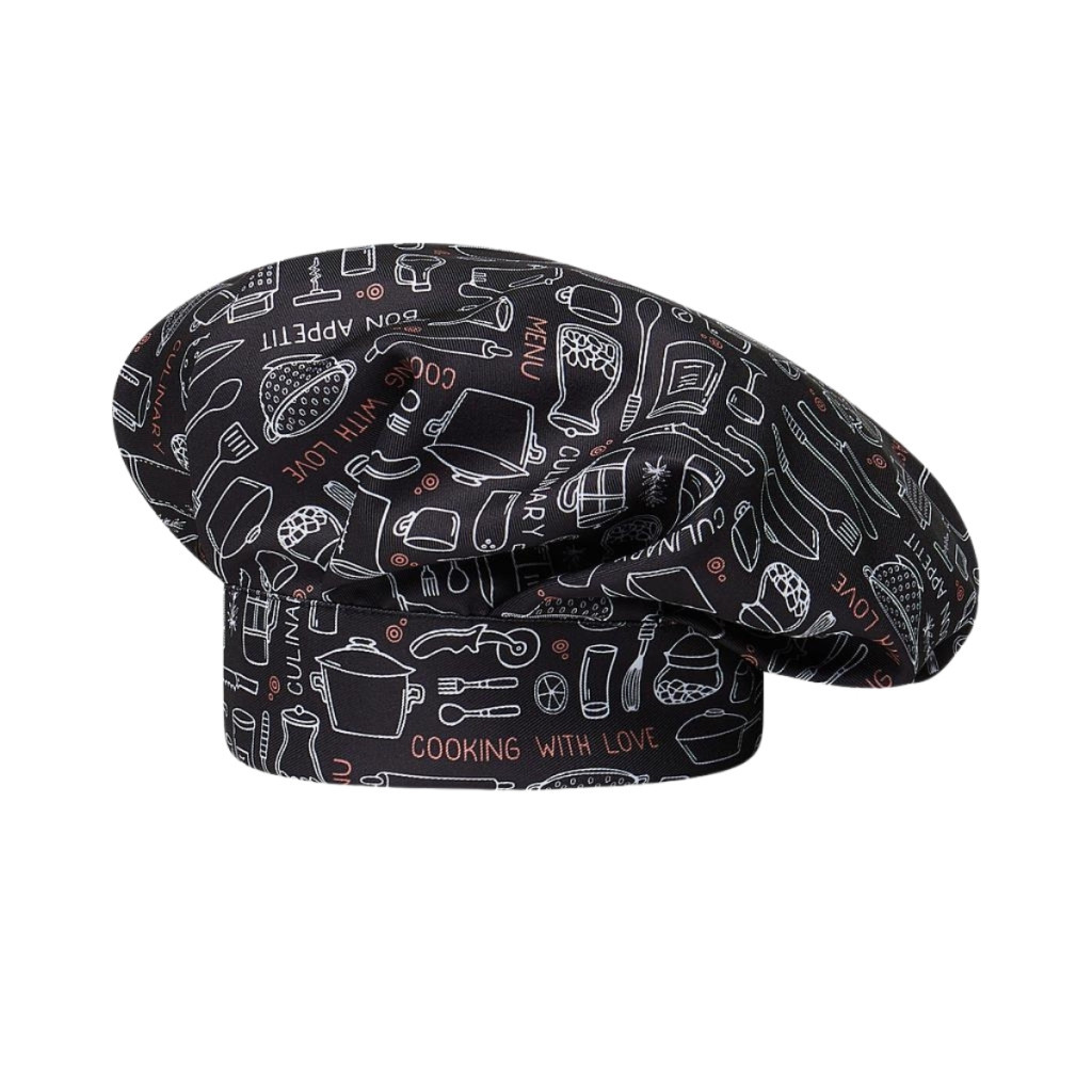 A Gran Chef tépőzáras mintás séfsapka unisex, egy méretű kivitelben készül tépőzáras állítással, így a körméret 54–60 cm között gyorsan személyre szabható, a szublimált minta pedig tartósan élénk, éles megjelenést ad intenzív konyhai használat mellett is.