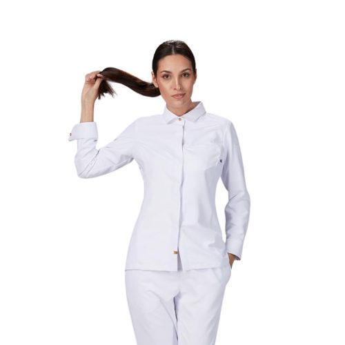 A GARYS MORAL női séfkabát testhez álló fazonban, olasz gallérral készül, ahol az első gomb látható, a többi pedig rejtett, így csinos, mégis profi megjelenést ad, miközben a felhajtható mandzsetta és a váll-/illesztő varrások kényelmes viseletet biztosítanak.