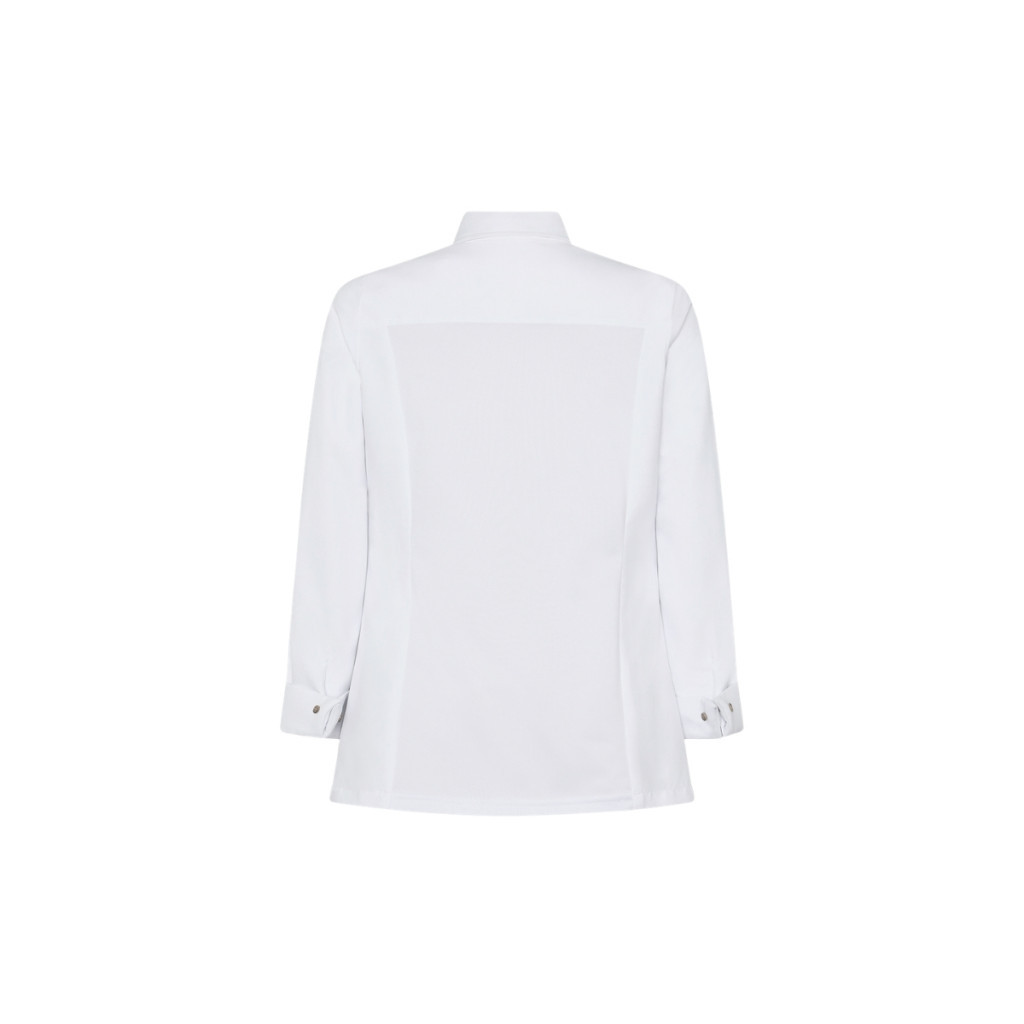A GARYS MORAL női séfkabát testhez álló fazonban, olasz gallérral készül, ahol az első gomb látható, a többi pedig rejtett, így csinos, mégis profi megjelenést ad, miközben a felhajtható mandzsetta és a váll-/illesztő varrások kényelmes viseletet biztosítanak.