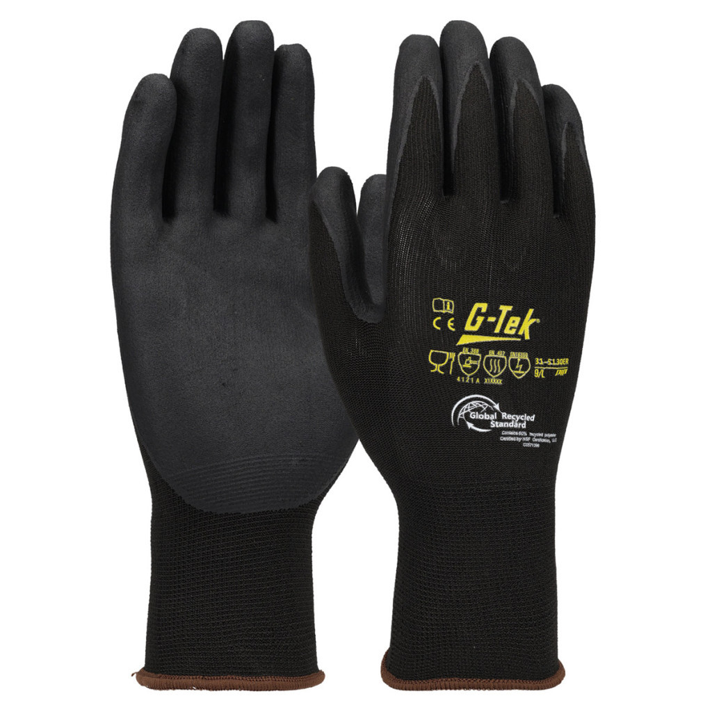 A G-TEK 3RX 15G kötött, nitrilhab tenyérmártott ESD munkavédelmi kesztyű újrahasznosított PET-palackból és spandexből készül, és kiváló tapadást, ESD-védelmet (EN 16350:2014), valamint élelmiszeripari megfelelést biztosít.